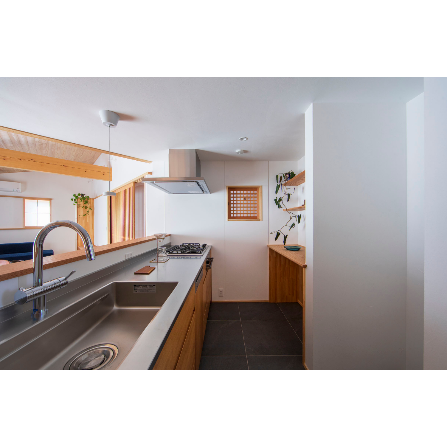 このキッチンの特徴は、壁に設けられた小さな格子窓です。窓の向こうは玄関土間になっており、わんちゃんたちの居場所になっています。料理をしながら様子をのぞいたり、姿が見えないときも気配を感じたりできる、暮らしに寄り添う工夫です。