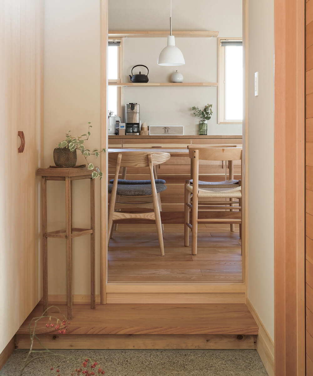 N様が家を建てるにあたり、ピアノスタジオを作ることに加え、もう一つ譲れない条件がありました。それは、「おじいちゃんのケヤキ」を使うこと、さらにそれを使いこなせるだけの技術と知識を持っていること。奥様のお爺様が林業を営んでいたことから、どうしても使いたかったといいます。硬質で美しいケヤキですが、完全に乾燥するまでに年月がかかるだけでなく、あばれや狂いも大きいため、扱いが難しい木。大切な思いが詰まったこの木をできる限り無駄にしないよう、最大限活用しました。こうして床に貼られたケヤキは、冬には乾燥で板同士の隙間が開き、夏には閉じてを繰り返しながら、日々呼吸をしています。