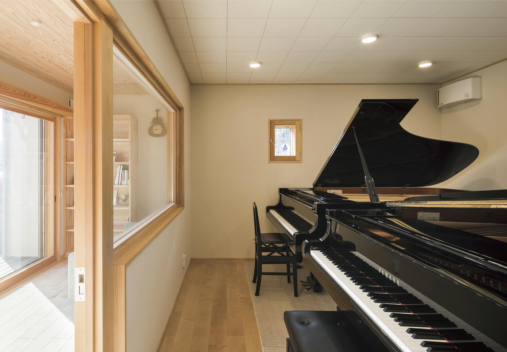 グランドピアノ2台が仲良く並ぶ10畳の防音室は、ピアノ講師をされている奥様のレッスンスタジオ。外部との間に大きなガラス窓と明るい廊下を配した、防音性と明るさの両方を兼ね備えた設計で、そよそよと庭の木が風になびく様子が見える、スタジオらしからぬ明るい空間。このスタジオに似合うよう、建具屋で誂えた木の防音扉も付けました。