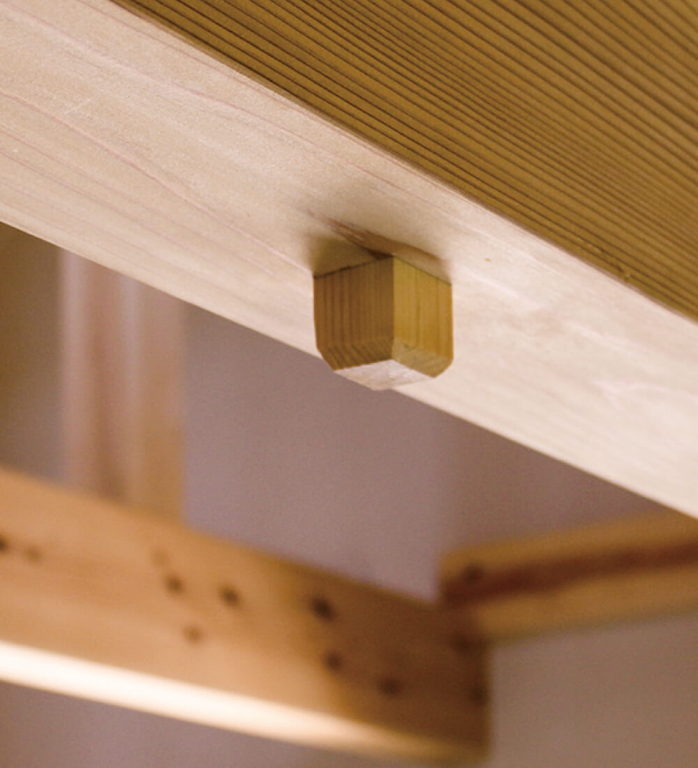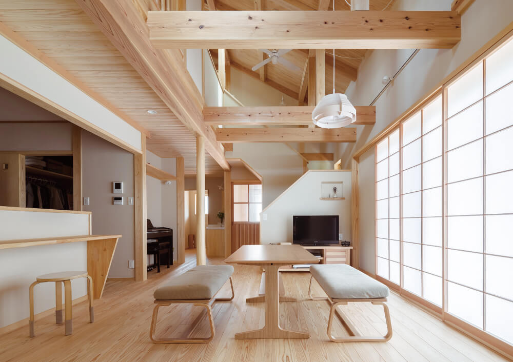 - 天井/杉化粧板 (1階)、小屋表し+杉化粧板 (2階)