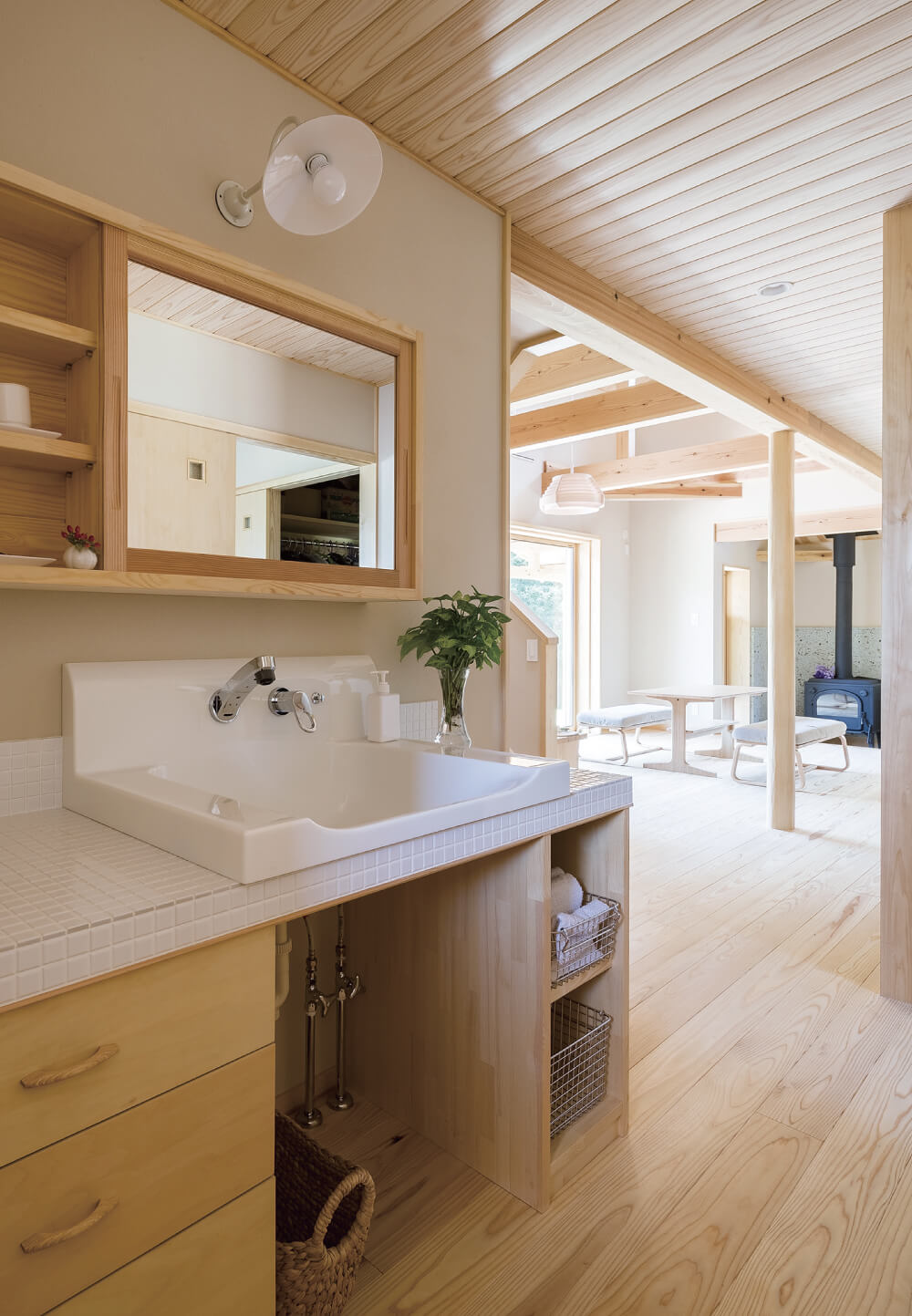 □ 左上 明るさを取るかスペースを取るかでずっと迷っていたという2階のフリースペースは、実は最近付け足したばかり。椅子をおいて大好きな読書のための空間にする予定。 □ 左下 きょうだいとも、自室よりもリビングで過ごすことが多いそう。 □ 右 鏡と扉を兼ねた棚をつけた、造作の洗面スペース。実験用シンクと迷った結果、水はねや使いやすさを考慮したものに。