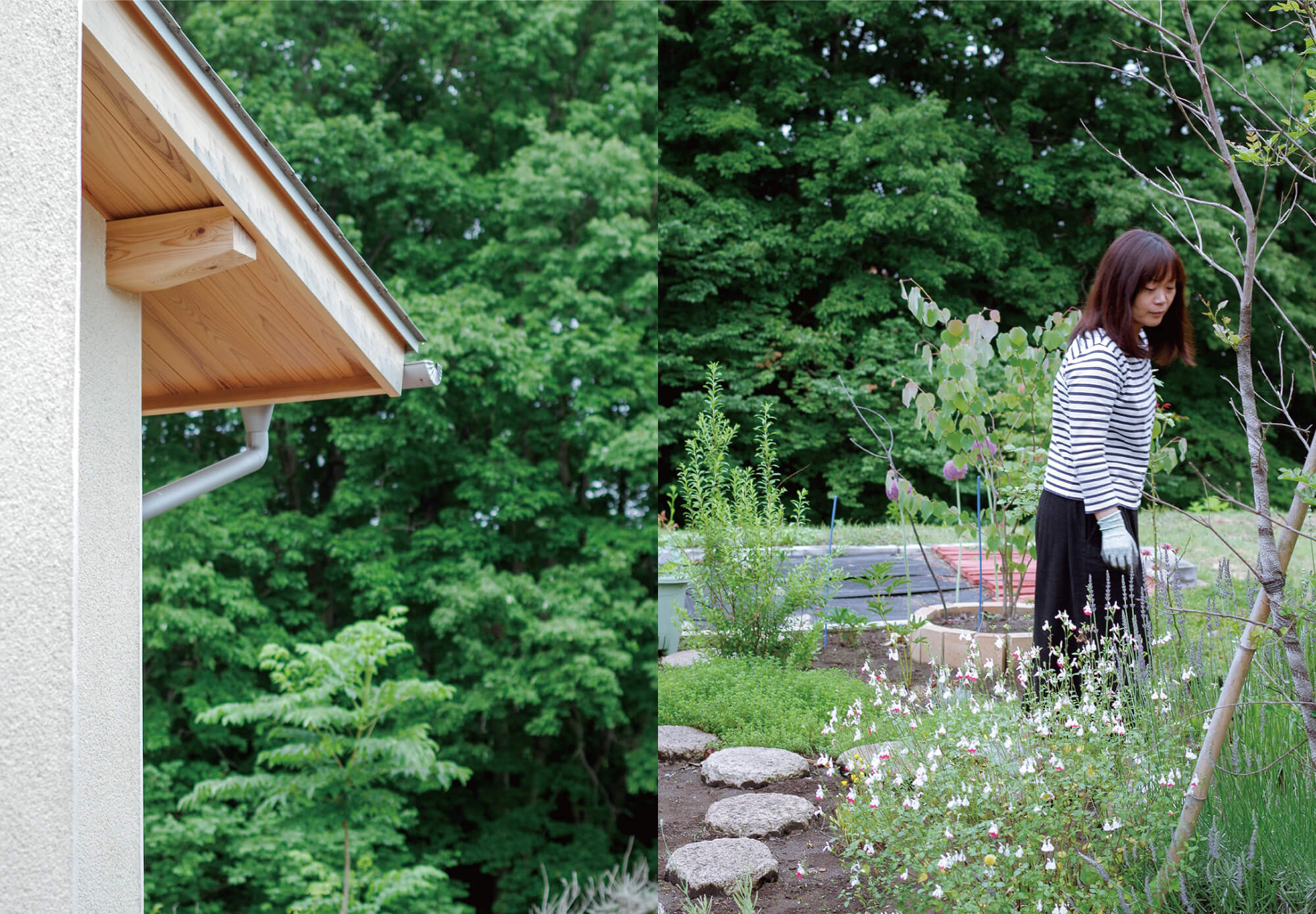 住み始めて2年、少しずつ育ててきた庭には、マルバノキやユーカリ、スモークツリーやジューンベリーなど、実の成るものや葉の美しい木々と、ハーブ類や宿根草などの優しい表情の植物が植えられ、丁寧に手を入れている様子が伺えます。お子様達と一緒にお庭の手入れをして過ごしたり、庭の植物たちでリースを作ったり。庭と家とを繋ぐ土間があるおかげで、暮らしがより豊かなものになっているそうです。