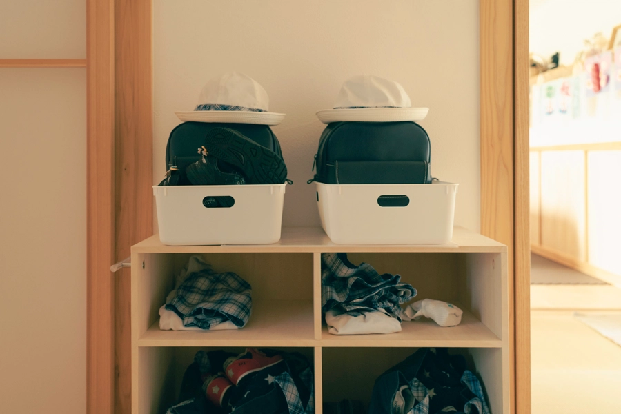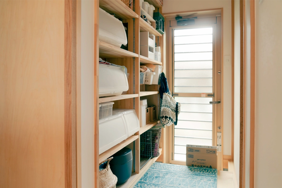 ご家族は3歳の双子の男の子と1歳の女の子のいるにぎやかな5人家族。それぞれに忙しい仕事を持つご夫妻のこだわりは、家事のしやすさでした。建築家・中村好文氏の手がけたキッチンを参考に、計画当初から具体的なイメージを描かれていたキッチンは、化粧垂木ののびやかな勾配天井の雰囲気とは正反対の小屋的空間のクローズドキッチン。続き間となっているため、目配りをしながらも集中して料理に取り組むことができます。
